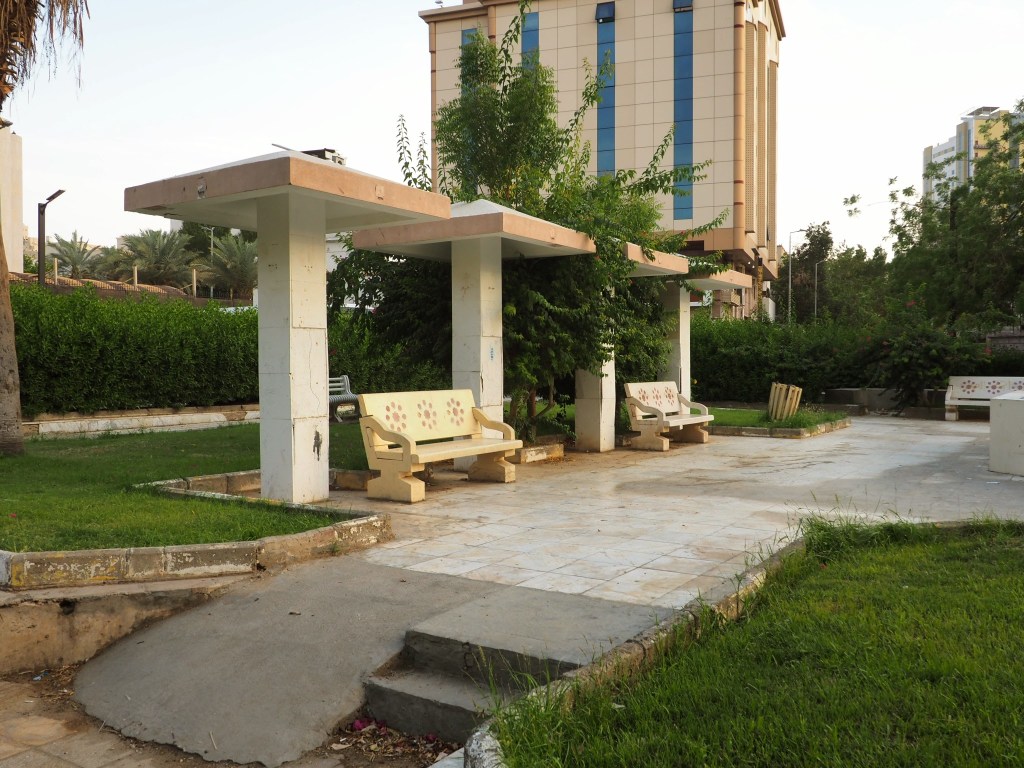 A view across Rose Garden Park. Someday back in March when looking for a calm place to relax out of direct sunlight and outside of the usual coffee shop, we found a park via a quick Google Map search of “parks” in Makkah. We pinched and zoomed and located a promising one that looked to be in an area we were familiar with, despite never noticing it before when passing by. On the map, it was labeled “Rose Garden” with some reviews stating it was a nice park, so we decided to go.