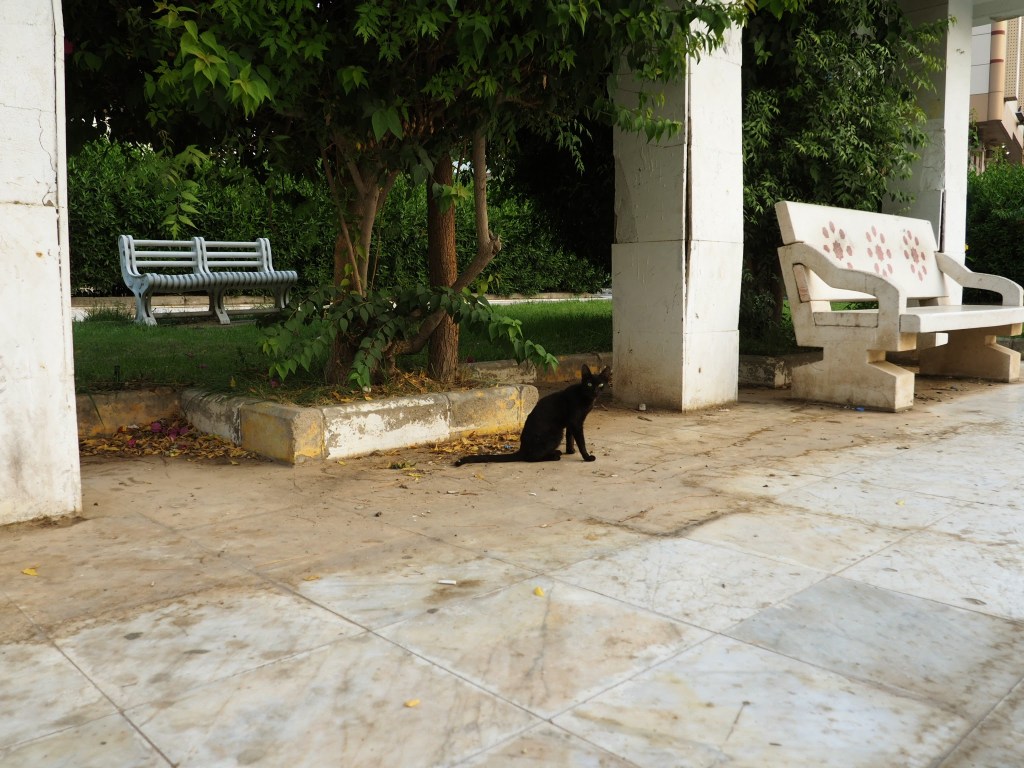 A prowling cat between the flowering bushes. The park is tucked in Az-Zahra District on Al Sarraa Street, and even though it is approximately a football field’s length away from the bustling Rusayfah Street (also known as Highway 80, a major a route passing through Makkah from Jeddah on the Red Sea to Dammam on the Persian Gulf), the park is a quiet, shady, green patch in the otherwise sunny, traffic filled city. Older three and four story homes surround the park secluding it, and small lanes branch off from the park deeper into the neighborhood.