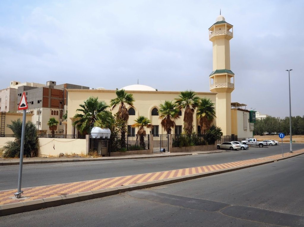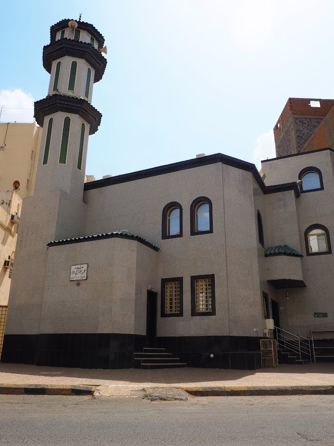 Al Hamra Mosque, Al Hamra, 2024. This is the de facto large mosque for the neighborhood, and is one of the older ones. The back of the mosque is attached to a grocery store.