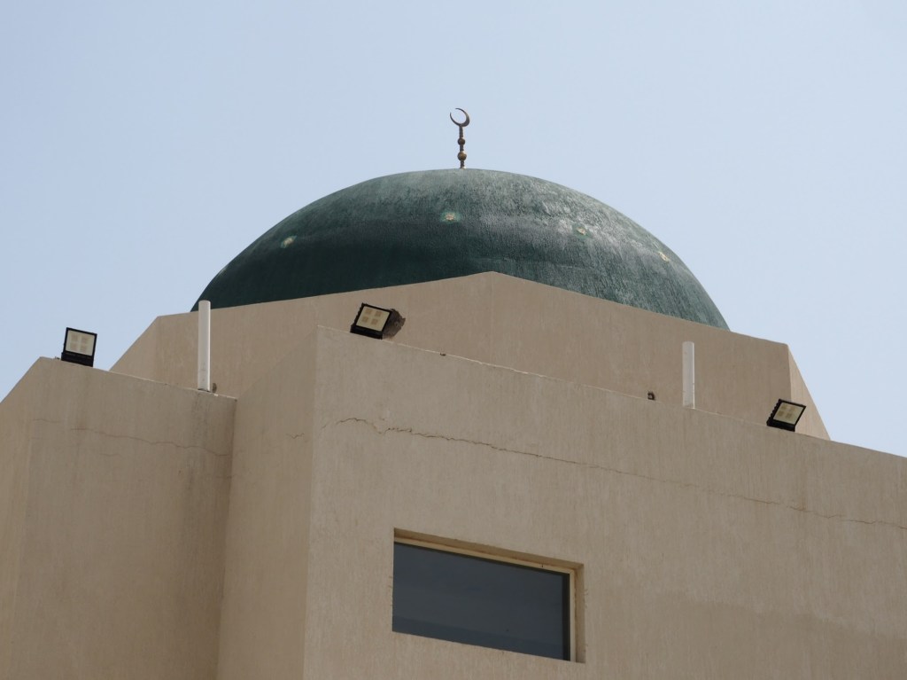 Masjid al-Amira, Dome and Minaret Detail, Al Hamra, 2024. The sign titles the mosque as “Jammah Al-Amira”. Jammah generally means gathering place and is a common title of mosques.