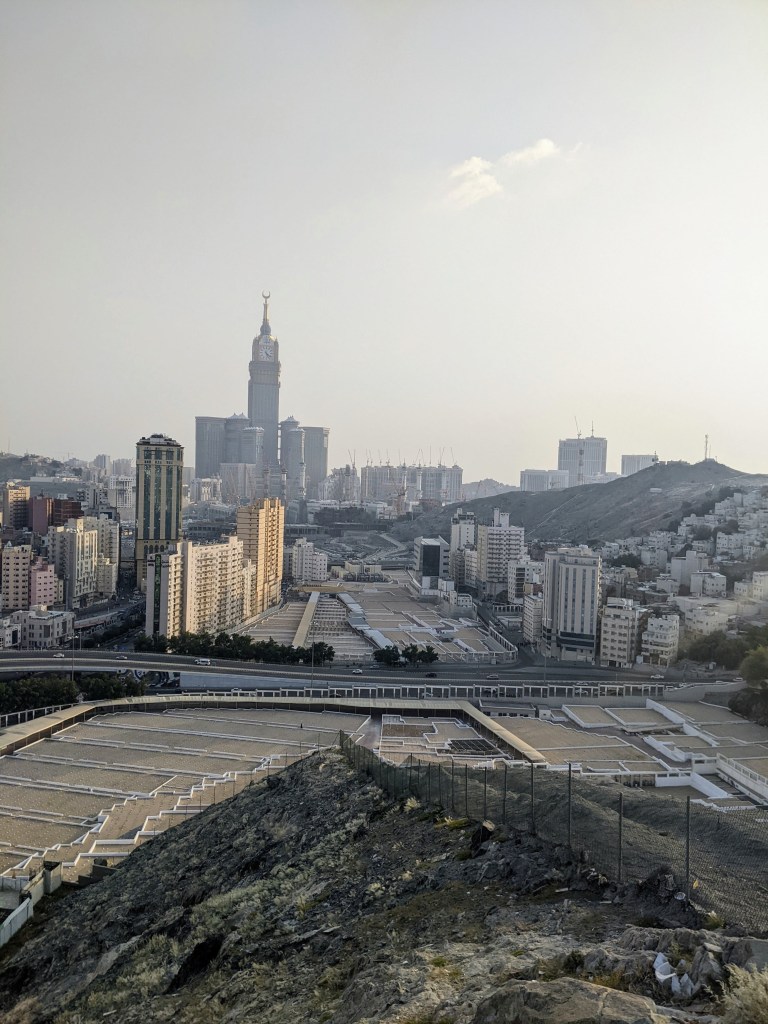 Viewing the Clock Tower from the North. Note the flat areas in the foreground – these are cemeteries in Makkah. Taken with Google Pixel 8. The clocktower can be seen from virtually everywhere inside the city and from a couple miles outside of the city. This is due to the layout of Makkah: the Masjid al Haram with the Kaaba is in the very center of the city, and the Clock Tower is a only few hundred yards away from it. Moving outward from the city center are highway-rings – four of them, with the First Ring Road circling just around the Masjid al Haram, and the furthest Fourth Ring Road circling the city proper. Many of the streets in the neighborhoods of Makkah point directly to the city center, so a view of the clock tower can almost always be seen.